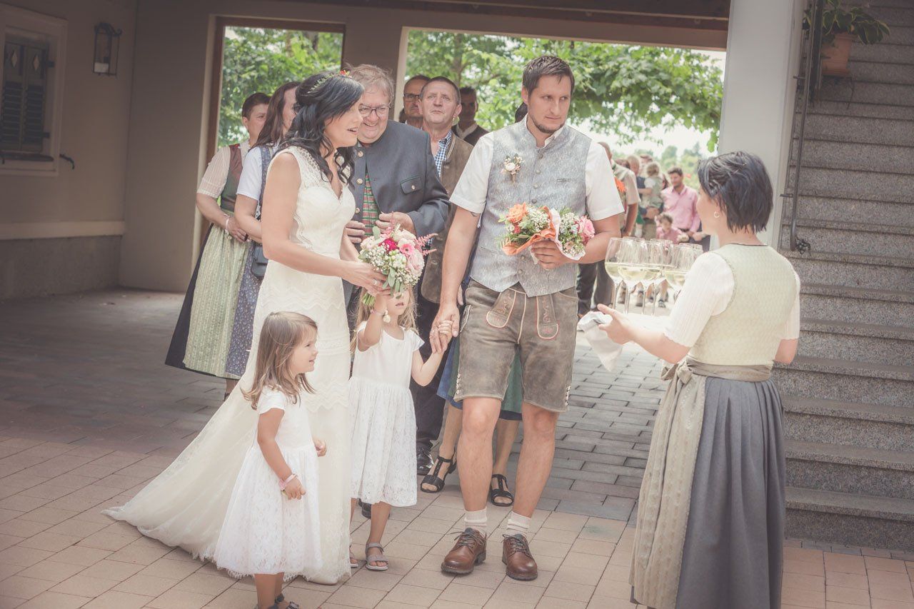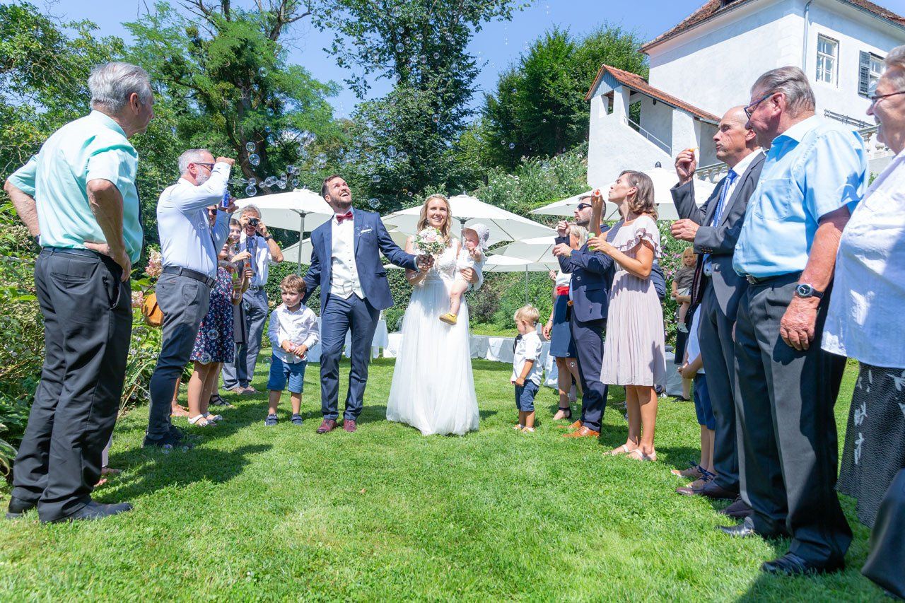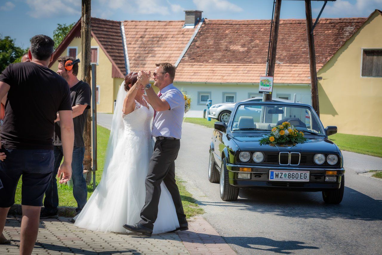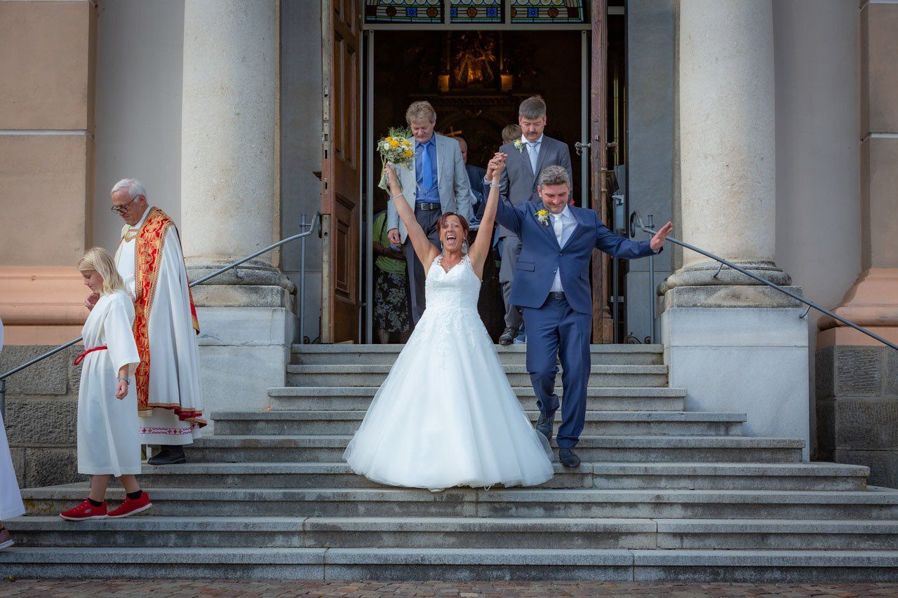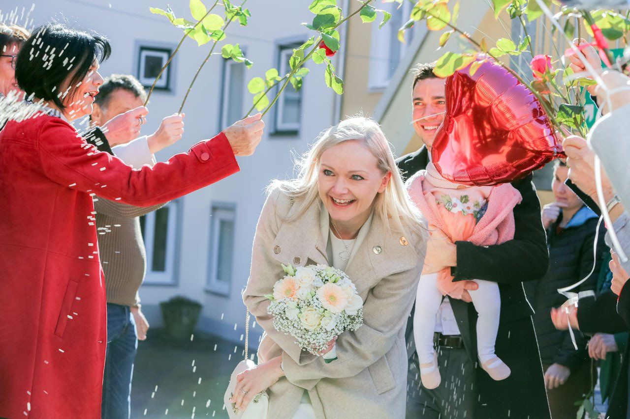 Nach der Trauung begibt sich das Brautpaar in der Regel vor die Kirche oder das Standesamt. Das ist der ideale Moment für herzliche, unvergessliche Bilder mit Ihren Verwandten und Freunden.